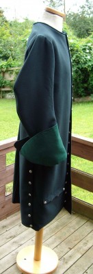 The new style of coat as worn in the Restoration era, and is the basis of the style that was retained throughout the whole of the Georgian era really, with alterations to seam lines arrangements of pleats etc, but really an iconic shape and style. Thsi coat has 50 buttons, most of which are non-functioning, unless you want them to be, in that the button whole are real and can be slashed as desired, but as the coat comes we only slash the buttons to the waist at the front as closure. Big "dog ear" style cuff, which on this coat is faced with pure silk to compliment the colour of the coat. Please click the image to see more images and to zoom in. P&P included within the UK.